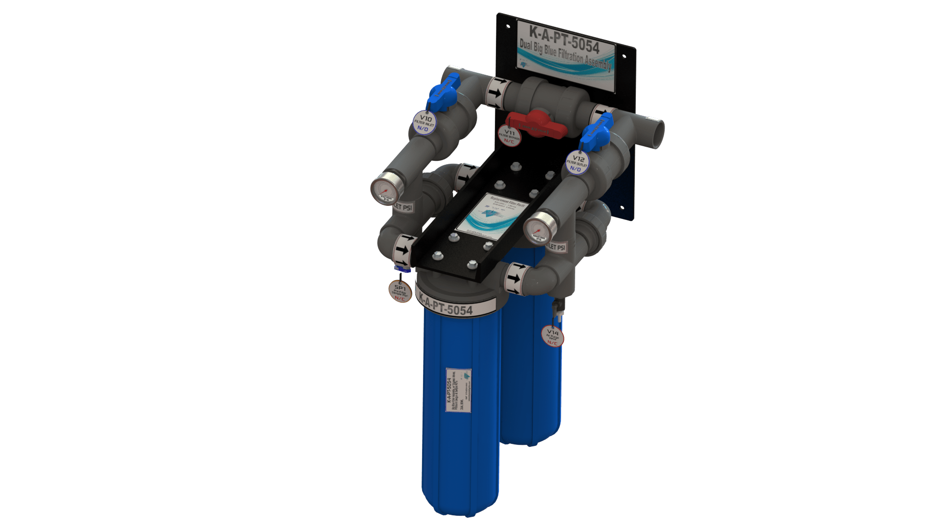 The Dual Big Blue Filtration was designed to remove particulate matter from the water source by occlusion using either a (1 or 5 micron) cartridge filter in a polypropylene housing before the media tanks.